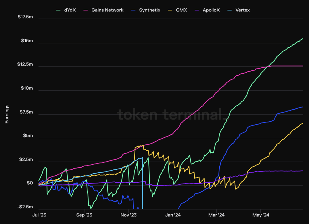 从利润指标看,GMX 过去 1 年的利润为 650 万美元,数据低于 DYDX、GNS 和 SNX。不过值得指出的是,这很大程度上是由于在去年 11 月-今年 3 月 Arbitrum 的 STIP 活动中,GMX 将获得的 1200 万枚 ARB(按照期间 ARB 的价格,平均约合 1800 万美元)全部释放了出去,导致利润降低明显。我们从利润积累的斜率可以看出 GMX 强劲的利润制造能力。