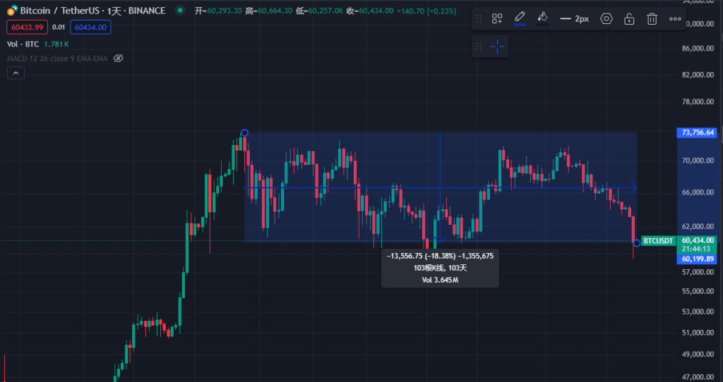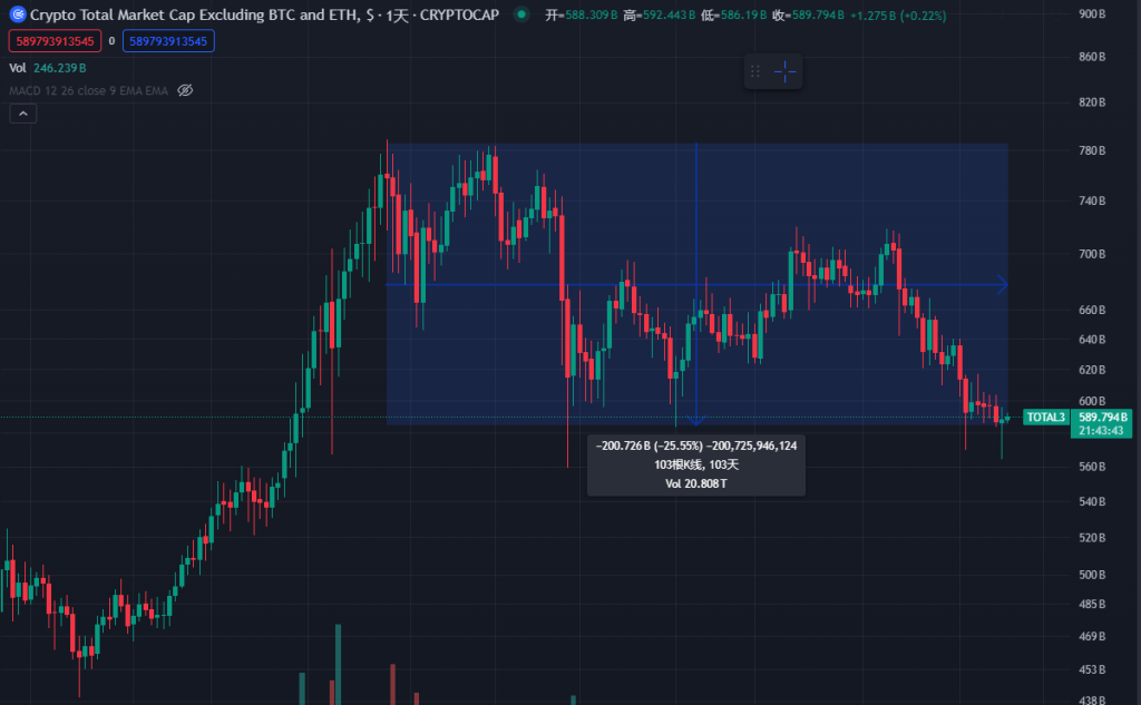 截至目前为止,BTC 的价格从高点下跌了 18.4% 左右,而山寨币的总市值(Trading View 系统中以 Tota l3显示,表示总加密市值扣除 BTC 和 ETH 之后的值)也仅仅下跌了-25.5% 。