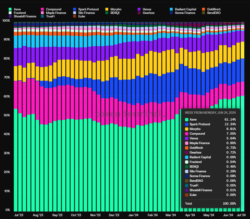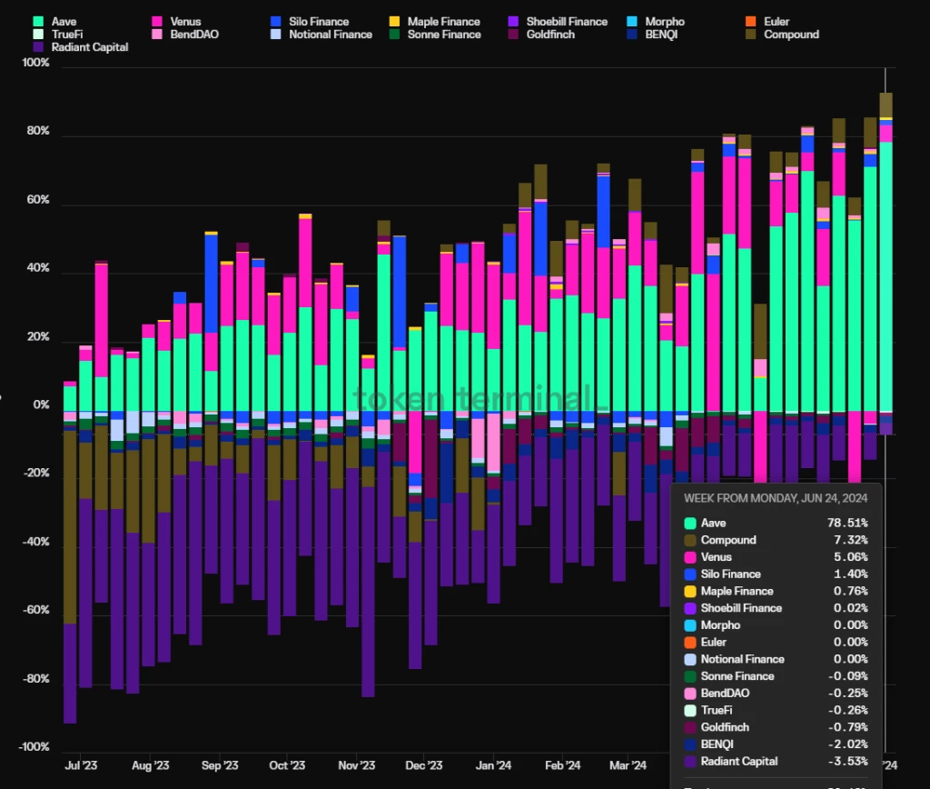 这些项目的护城河多种多样,有些来源于服务的多边或双边网络效应,有些来自于用户习惯和品牌,有些则源于特殊的生态资源。但是从结果来看,Defi 的头部项目们在各自的赛道都呈现出某些共性:市场份额趋于稳定、后来竞争者减少、具有一定的服务定价权。
