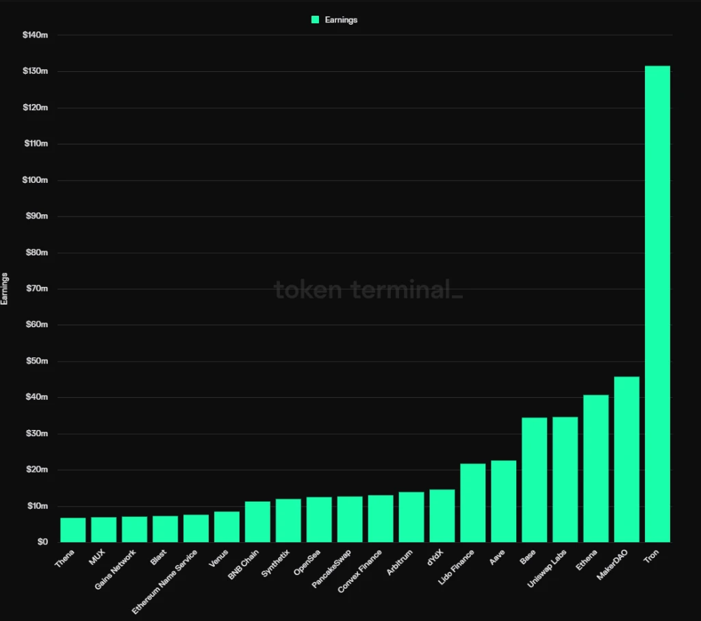 根据 Tokentermial 的统计数据, 2024 年截止目前利润最高的前 20 大协议中, 12 个是 Defi 项目,分类来说是: