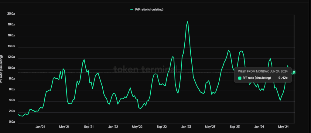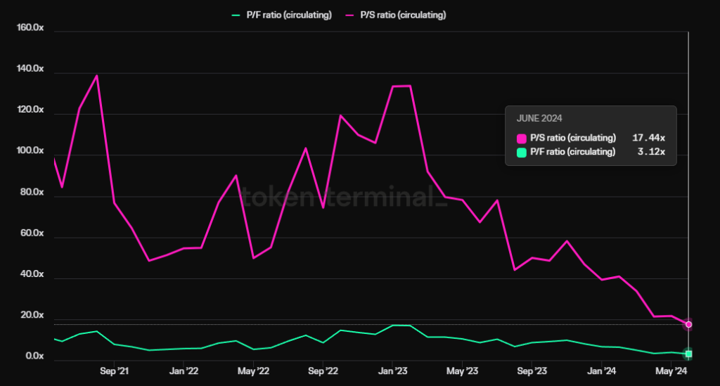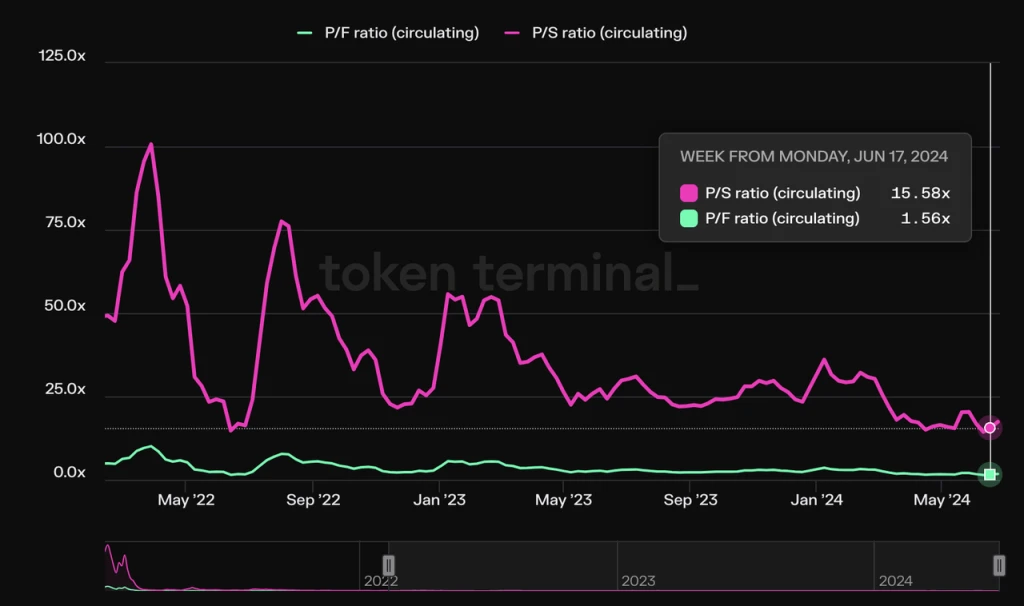 尽管 Lido 的市场份额出现了略微的下滑,但 Lido 的质押规模仍然随着 ETH 本身质押比率的提升而上升。从估值指标上来说,Lido 的 PS 和 PF 均在近期创出历史新低。