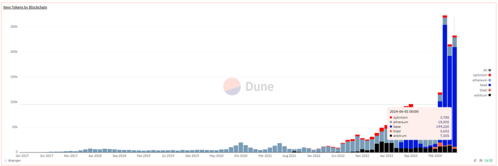 New Tokens by Blockchain,数据来源:https://dune.com/queries/3729319/6272382