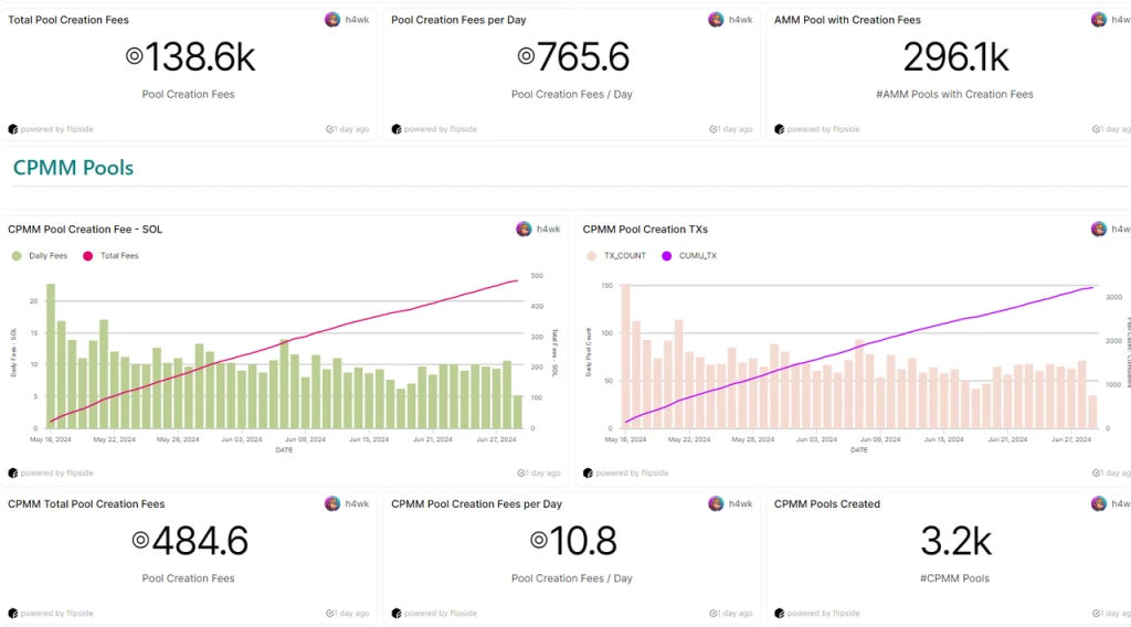 除了手续费部分的收入之外,Raydium 还会对新创建的池子收费, 目前基于 AMM 标准池创建收费 0.4 Sol,创建 CPMM 池收费 0.15 Sol,目前 Raydium 每天平均收到的池子创建费用就高达 775 Sol(按 6.30 Sol 价格计算,约合 10.8 万美金。不过这部分费用即不归入国库,也不用于 Ray 的回购,而是用于协议的开发和维护,可以理解为团队收入。