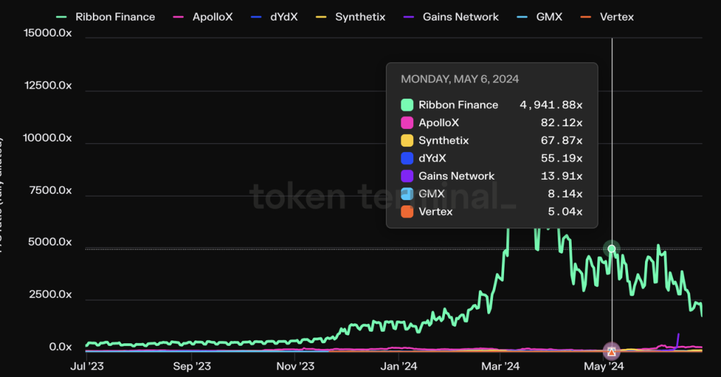 在永续合约交易平台领域,由于明牌表示有追溯性空投的新项目频出(如 Aevo、Hyperliquid、Synfutures、Drift 等等),并且老项目也都普遍存在类似交易挖矿激励的情况(如 dYdX、Vertex、RabbitX),使得交易量的数据并不具备太多的代表性。我们将选取 TVL、PS 和利润指标来横向对比 GMX 和竞争对手的数据情况。