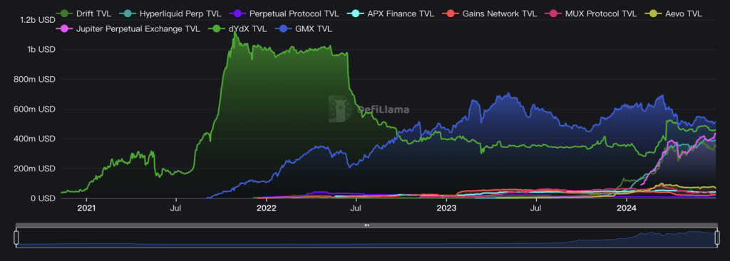 在 TVL 方面 GMX 目前居首位,不过老牌衍生品协议 dYdX、坐拥 Solana 大量流量入口的 Jupiter Perp 以及尚未发布的 Hyperliquid 的 TVL 也在同一量级。