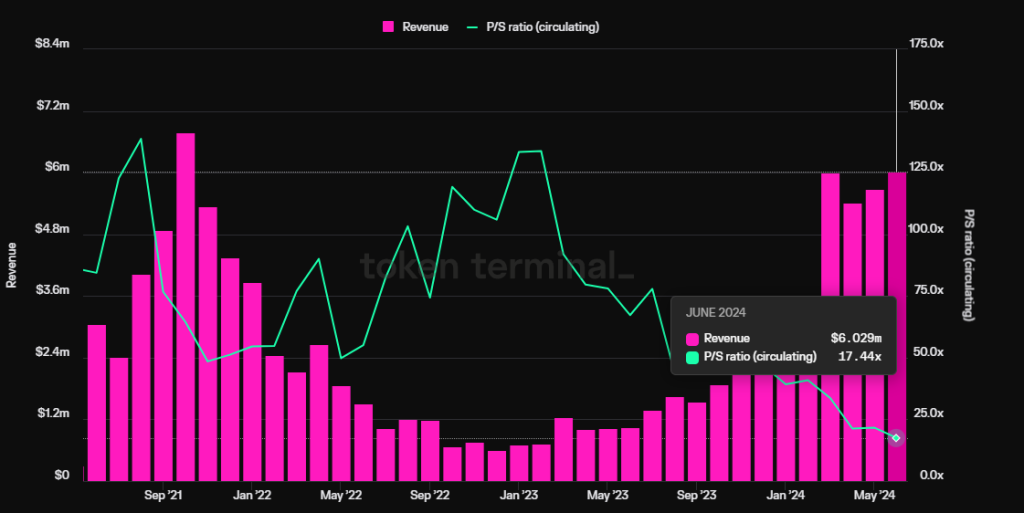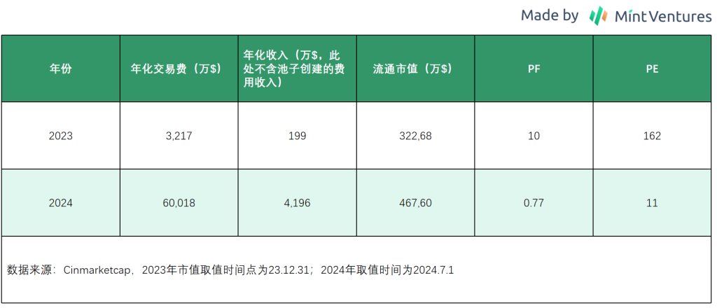 由于缺少 23 年以前的历史数据,笔者仅以 Raydium 今年上半年的估值数据与 2023 年的估值数据进行对比。