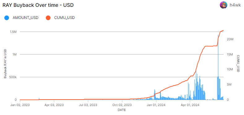 Raydium 在 2024 年上半年用于回购 Ray 的协议收入约为 2098 万美金,这个值是 2023 年全年 Ray 协议回购金额的 10.5 倍。