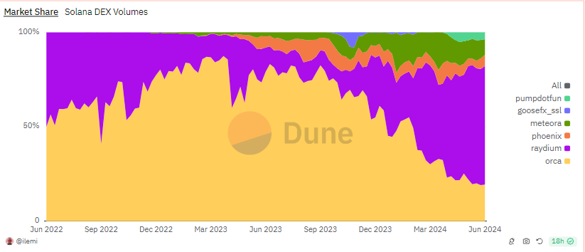 而 Raydium 的竞争对手 Orca,则选择全面拥抱 Uni V3类型的集中流动性池模型。对于每天需要大批量生产、大批量配置流动性的 Meme 项目方来说,Raydium 的标准 AMM 模型更加适合,因此 Raydium 成为了 Meme 类代币的首选流动性场所 。