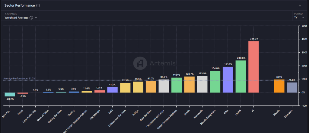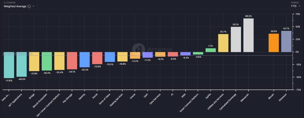 而本轮需求端和叙事的疲软,叠加资产供给端的超量发行是加密周期里的第一次,尽管项目方尝试通过进一步降低上市时的代币流通比率(从 2022 年的 41.2% 降至 12.3% )来维持估值,并逐渐抛售给二级投资者,但两者的共振终于还是导致了这些加密项目估值中枢的整体下移, 2024 年各大板块中仅有 Meme、Cex、Depin 等极少的几个板块维持正收益。