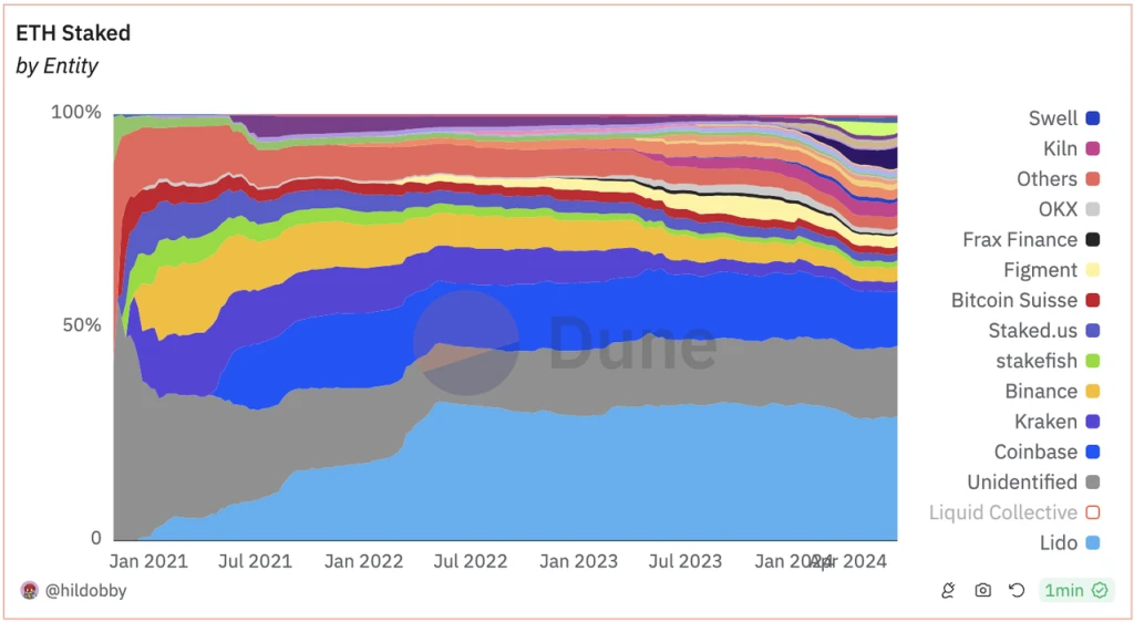 ETH 质押市场份额历史情况(最下方浅蓝色块为 Lido) 来源 Dune