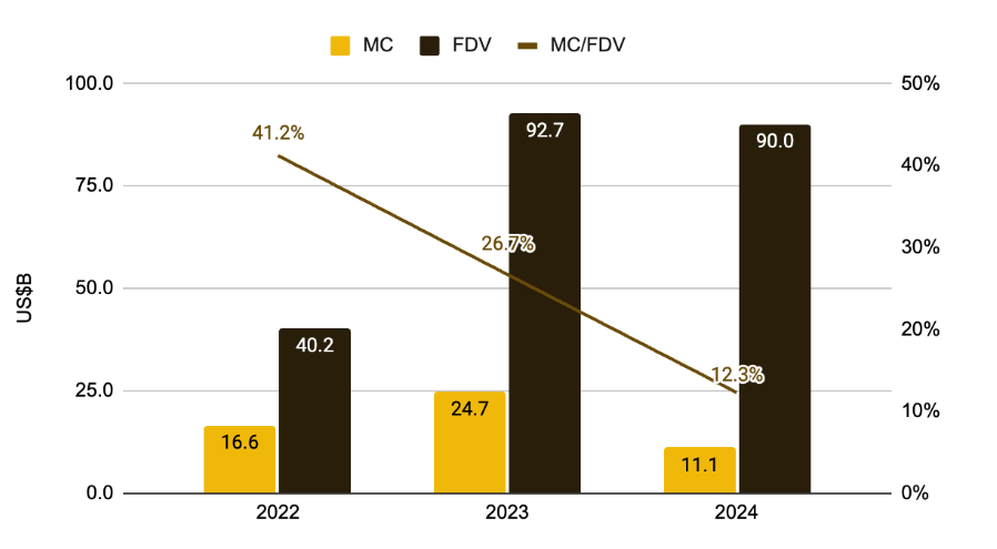 新币 MC 与 FDV 的比率关系,图片来源:《Low Float & High FDV: How Did We Get Here?》,Binance research