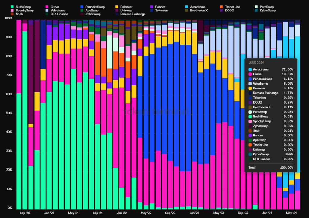 生态位置:Raydium 与 Uniswap 一样同样面临生态位置的问题,且在 Solana 生态,以 Jupiter 为代表的聚合器拥有更大的影响力,其交易量也远超 Raydium(6 月 Jupiter 的总交易量为 282 亿,Raydium 为 168 亿)。此外,以 Pump.fun 为代表的 Meme 平台,逐渐取代 Raydium 发起项目的场景,更多的 Meme 通过 Pump.fun 启动,而非 Raydium,尽管双方目前是合作关系。Pump.fun 平台在项目端逐渐取代了 Radyium 的影响力,而 Jupiter 在用户端也超越了 Raydium 对交易者的影响力。这一情况如果长期得不到改善,如果位于生态上游的 Pump.fun 或 Jupiter 自建 Dex,或是转向竞争对手,将对 Raydium 形成重大影响。