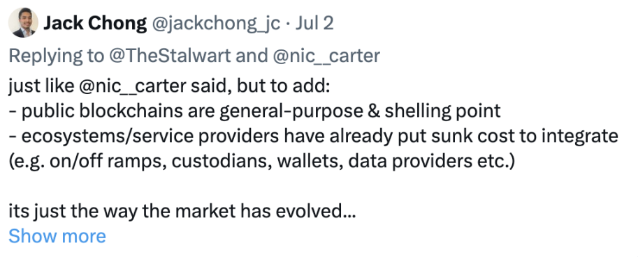 这也解释了为什么公共区块链可能会实现 Lindy 效应(译者注: Lindy 效应即 Lindy Effect,是指某个事物存在的时间越长,它未来继续存在的可能性就越大),因为它们是所有市场参与者协调的焦点。