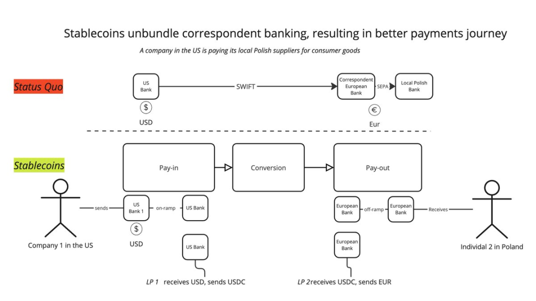 当前,稳定币有一个非常明显的效用: 通过一组新的服务提供商来解构传统的代理银行网络。 不再依赖单一的 SWIFT 交易,现在你可以将其分解为: 入金 -> BaaS -> LPs 转换 -> BaaS -> 出金。这样,你可以在每个环节中结合最优的服务,提供更好的用户体验。