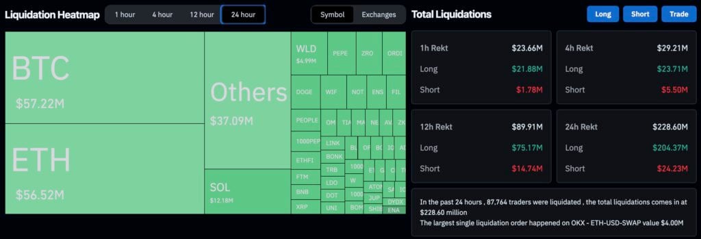 比特币反覆洗盘的行情下,据 Coinglass 数据 显示,过去 24 小时,加密货币全网爆仓金额超过 2.2 亿美元(多头占 2 亿美元),有近 9 万人遭清算。