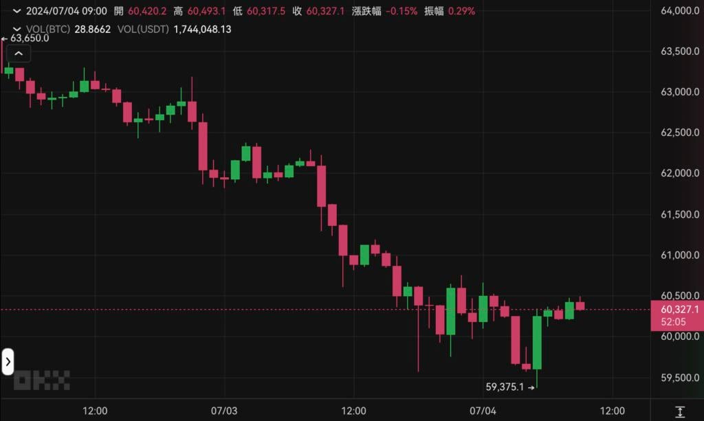 原 本市场期待比特币在 7 月会出现反弹,但市场的乐观情绪昨日又被泼了一盆冷水。BTC 在昨(3)日傍晚 18:00 左右插针来到 59,570 美元,虽然一度又回到 6 万美元之上,但今(4)晨五点多又进一步下杀,最低报 59,375 美元。