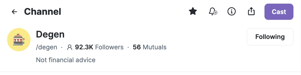 Degen 频道也是鱼龙混杂,充斥着各类喊单信息、推广信息,同时也有一定比例的 Alpha 优质信息,因此,频道介绍便直接言明——“不构成投资建议”。当然,该频道的优质内容相对也更容易得到 DEGEN 代币打赏。值得一提的是, /mfers 频道 (关注者数量约 1.75 万人)的相关成员在该频道也极为活跃,因此值得多多交互。