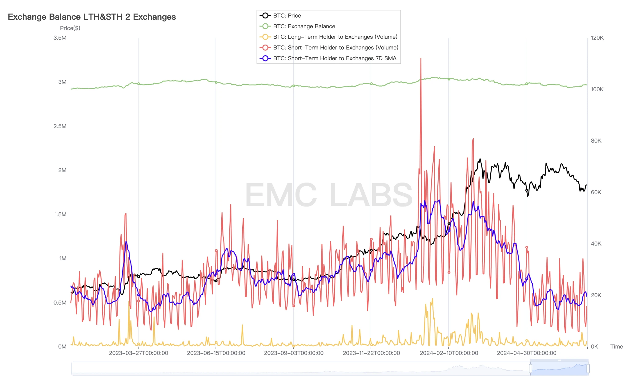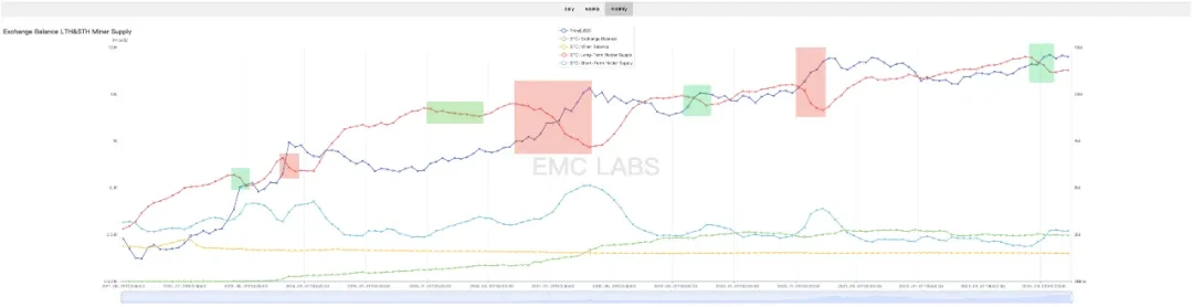 长期投资者、短期投资者、交易所和矿工持仓变动分析(EMC Labs 制图)