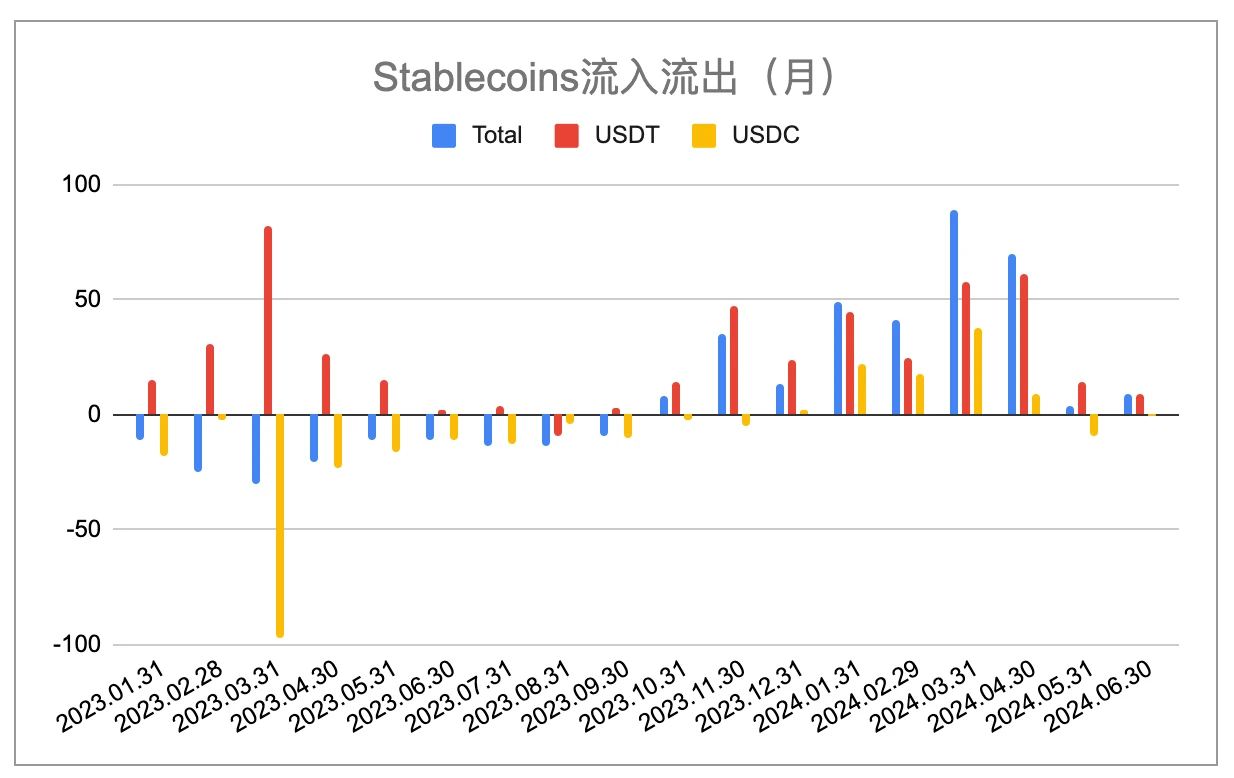 1 月批复运营以来,BTC ETF 被视作加密资产市场重要的新增资金流入通道。1 月以来,全渠道总计流入 138.82 亿美元,但 3 月起伴随 BTC 价格止步 73000 美元后流入规模呈逐步下降趋势。6 月份 ETF 通道资金流入为 6.41 亿美元,与稳定币通道的 8.56 亿美元已相当接近。在 5 月报告 中,我们提出“ETF 通道资金有望成为为 BTC 进行定价的独立力量”。伴随规模的增长和决策意志的逐渐独立,这一通道的资金有望承担此一重任,其规模和行为值得持续关注,但目前尚难堪此任。