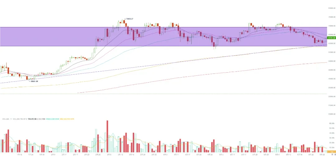 6 月,BTC 开于 67473.07 美元,收于 62668.26 美元,全月下跌 4804.15 美元计 7.12% ,振幅 20.10% ,成交量连续 3 个月萎缩。