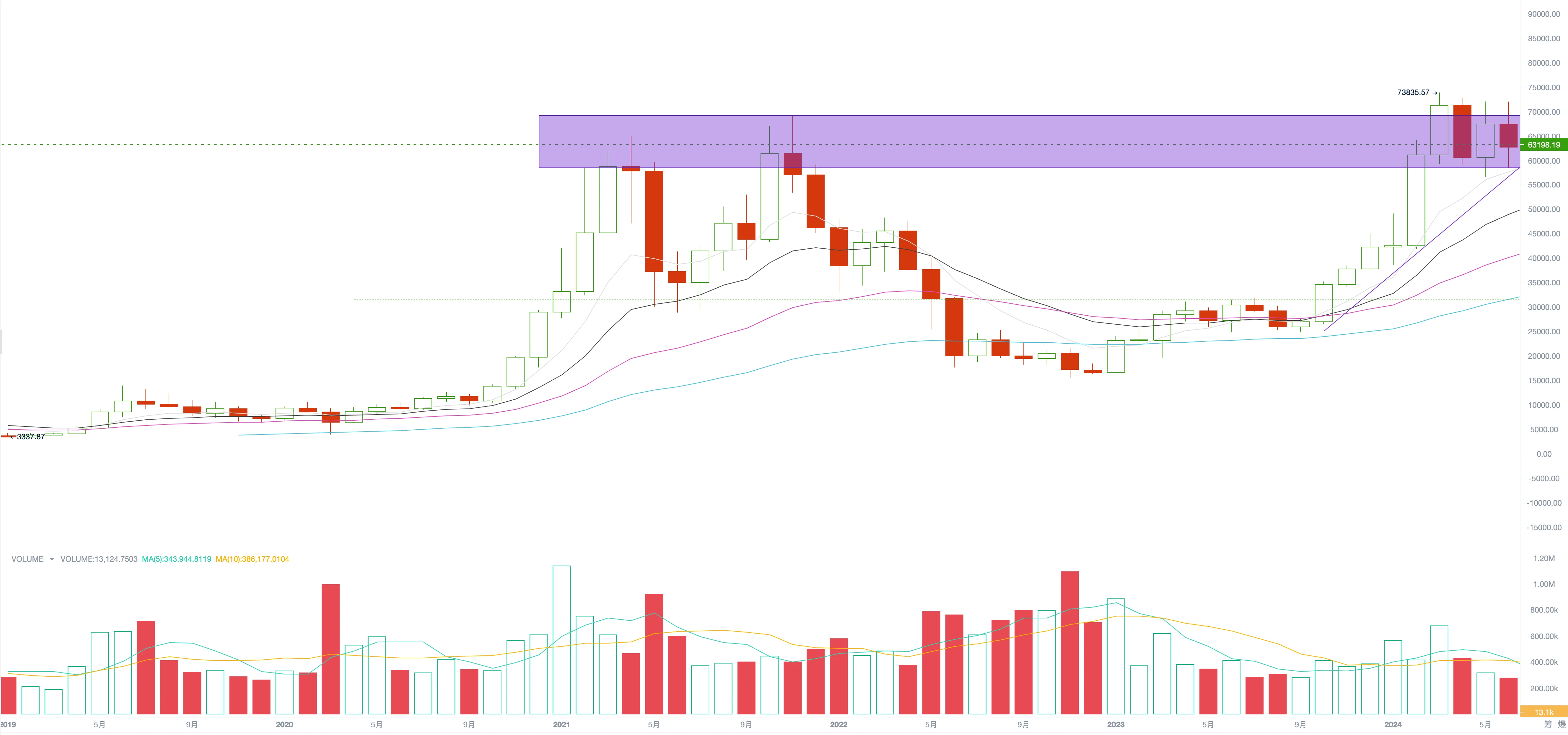 3 ~ 5 月,市场各方围绕 BTC 前高价格 69000 美元所做的筹码交换是市场周期中的主要活动之一,它的发生意味着牛市第一阶段的进行。低频交易者(长期投资者)持有的筹码流入高频交易者(短期投资者)手中,市场流动性突然泛滥,新进资金被卖力消耗一空,价格下跌,投机遇冷,激情狂暴之后市场重回犹疑阶段。牛市是否会就此戛然而止?我们将目光投向此前几轮牛市。