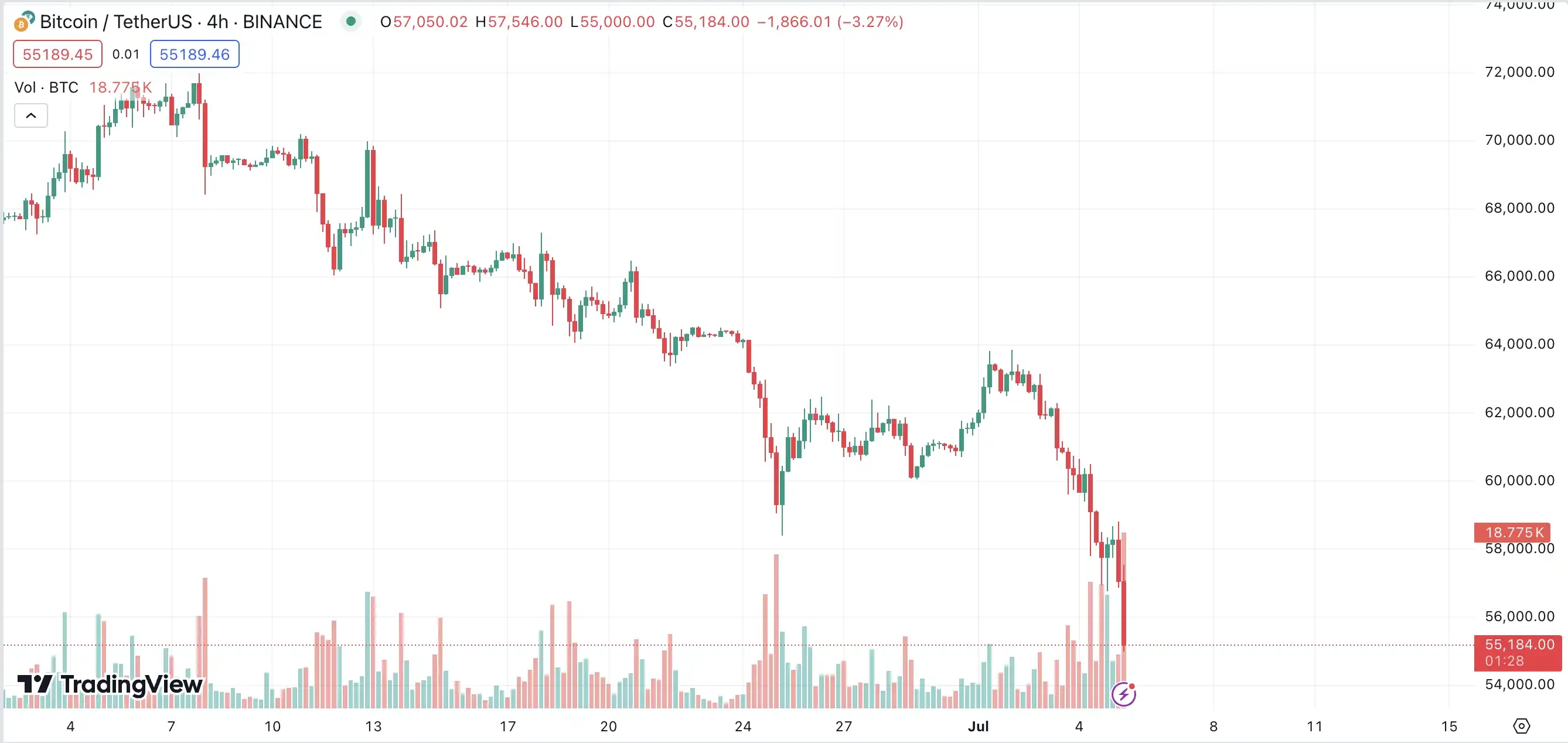 6 月 24 日,比特币跌破短期高位 64, 000 万美元。今日,比特币又跌破 54, 000 美元, 24 小时跌幅扩大至 8.8% 。「 6 · 18 大促」持续至今,遭 7 · 5 暴跌,迎来属于币圈人的黑色星期五。