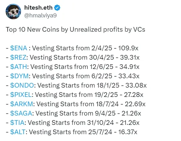 此前,数据分析平台 DYOR 的联创 hitesh.eth 于 X 上贴出了一组数据,盘点了当前市面上较为典型的十大“VC 代币”。