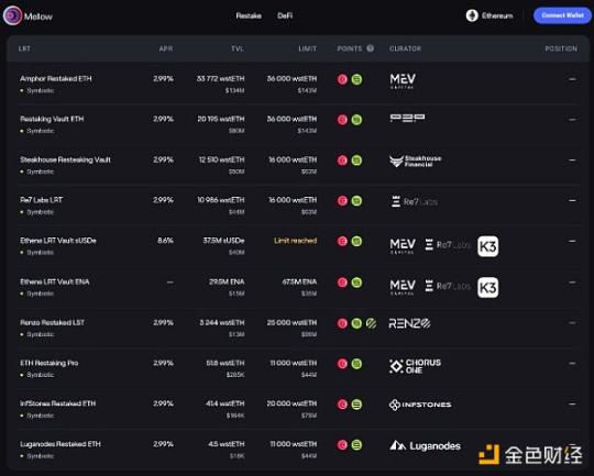 (middleware)层,提供可定制的流动性再质押金库。有了 Mellow,任何人都可以成为自己的 Ether.Fi 或 Renzo,建立他们自己的 LRT 金库。这些 Mellow 上的第三方“管理者”将完全控制要接受哪些再质押资产,然后用户将根据自己的风险偏好选择资产,并为此支付一定的费用。