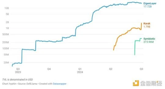 EigenLayer、Karak 和 Symbiotic 上的锁定资产总价值(包括所有链)如下: