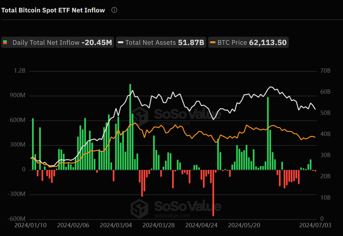 比特币现货 ETF 作为买卖盘的重要数据,可用作观测市场的买入与卖出强度。不过观察下来,其数据不容乐观,据 SoSoValue 显示,7 月 3 日的总净流出达到 2044.95 万美元,为过去 5 日净流入后的首次净流出。
