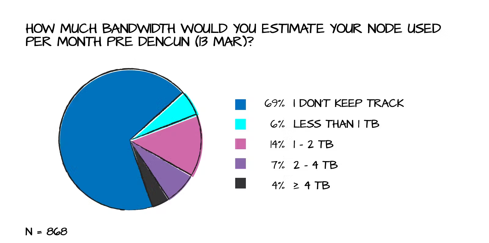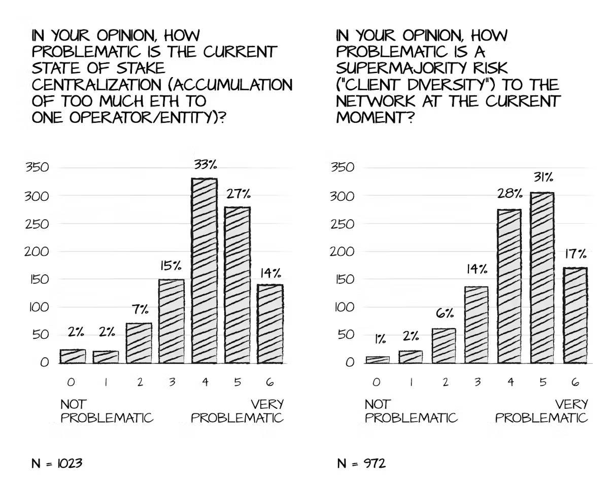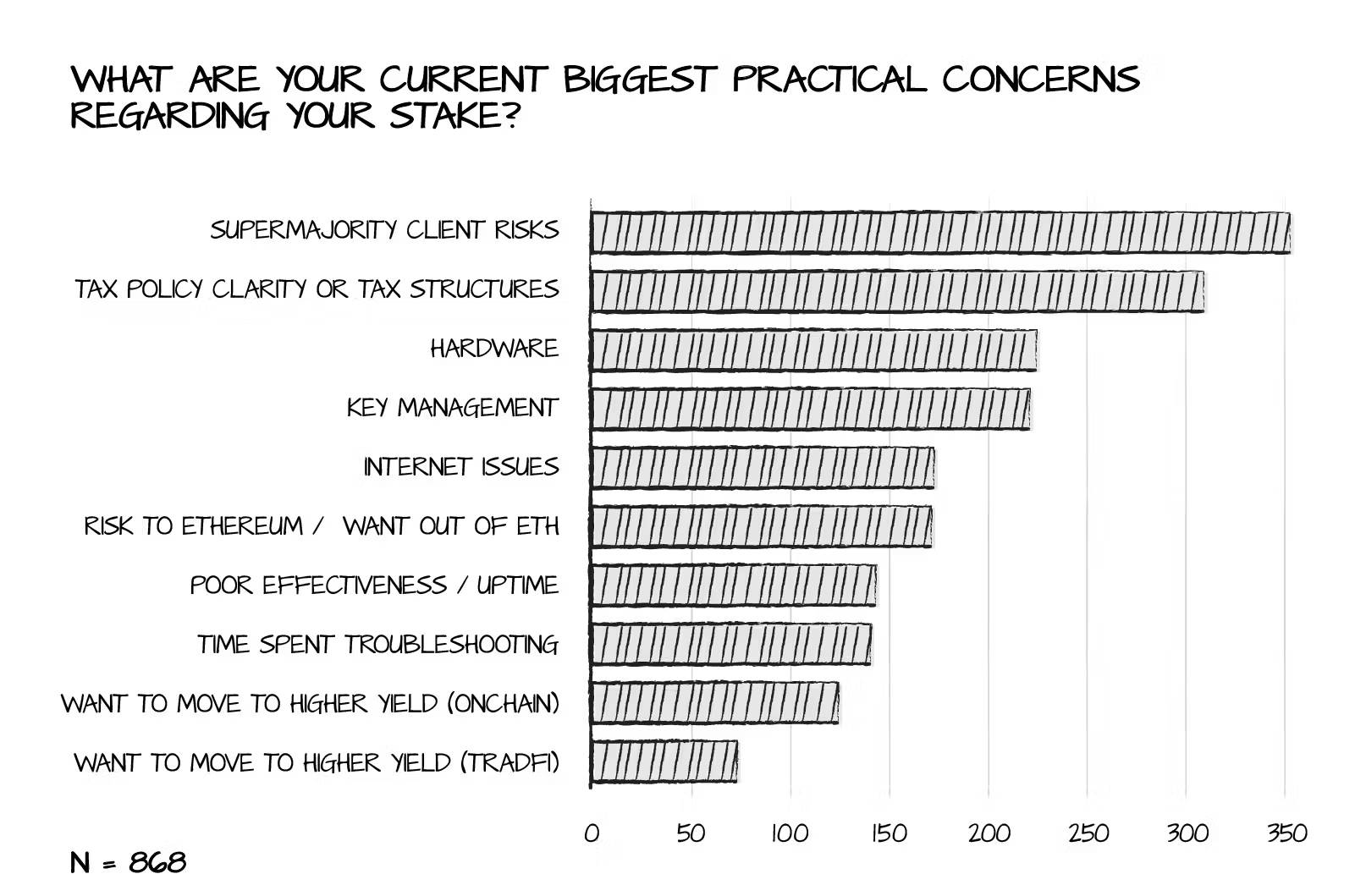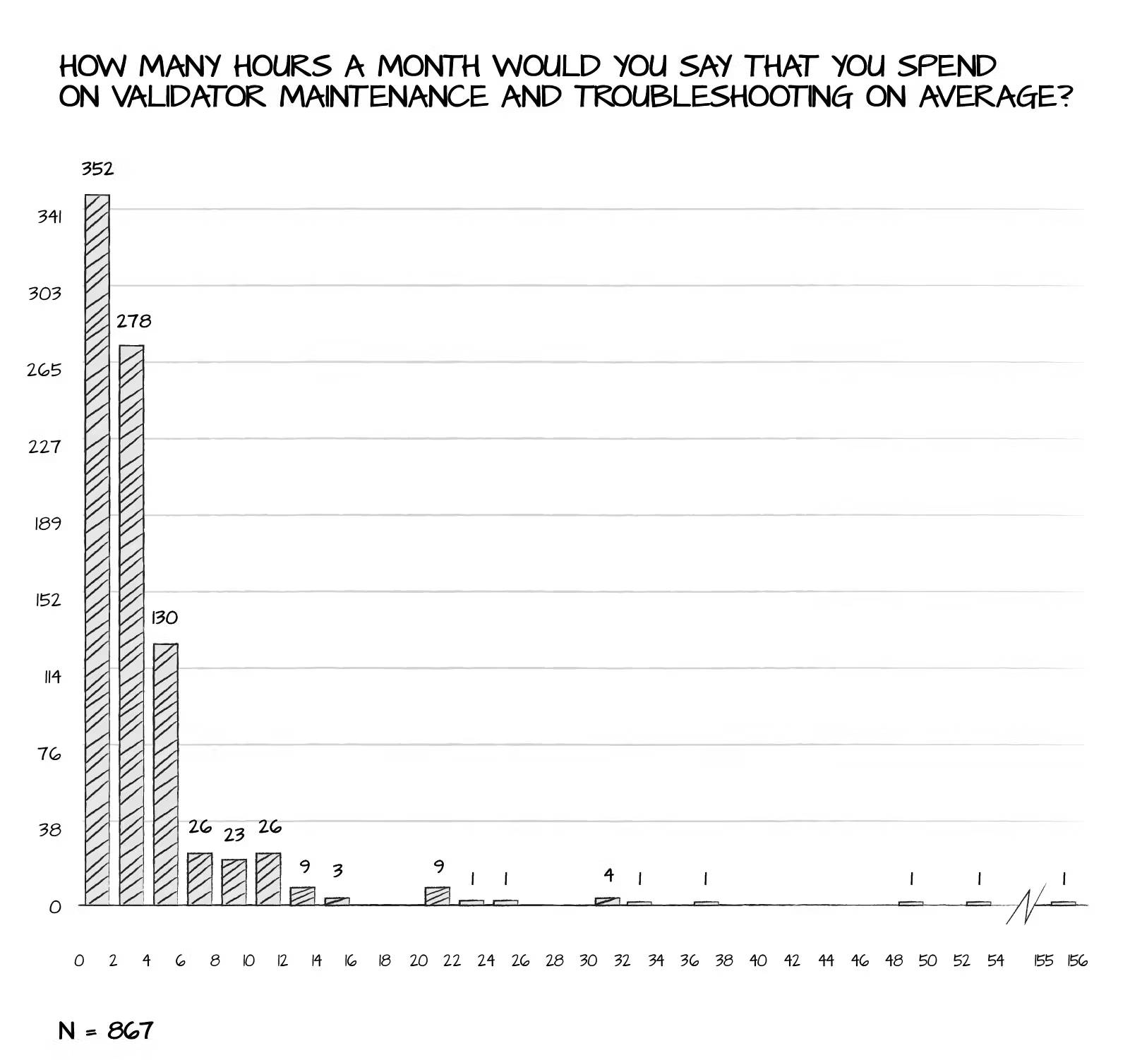 图 6:您是否使用过软件来帮助您质押? 主要关注点 主要关注点包括绝大多数客户风险、质押的次优税收结构、硬件问题和密钥管理 ✶。 69% 的人不跟踪他们的带宽,78% 的人不确定自 Dencun 以来带宽是否增加了。 受访者平均每月花费 3.4 小时(中位数为 2 小时)维护其设置。去掉一个离群数据点(x = 155 小时),该数据点的 Z 值为z 分数为 22 的单个异常数据点(x = 155 小时),则平均每月维护时间为 3.2 小时。 在 1-10 分的评分中,10 分代表网络可能面临的最大风险,投票者将超级多数风险评为 7.4 分,将质押中心化的风险评为 7.2 分(为清晰起见,对评分标准进行了调整)。 当被问及预计 2-3 年内 ETH 的质押比例时,答案(n = 1003)平均为 49.4% 的 ETH。 当被问及他们怀疑有多大比例的 ETH 质押是由像他们这样的独立操作员操作时,答案(n = 924)平均占 ETH 质押的 15.9%。