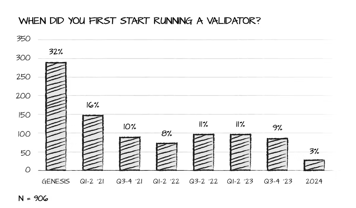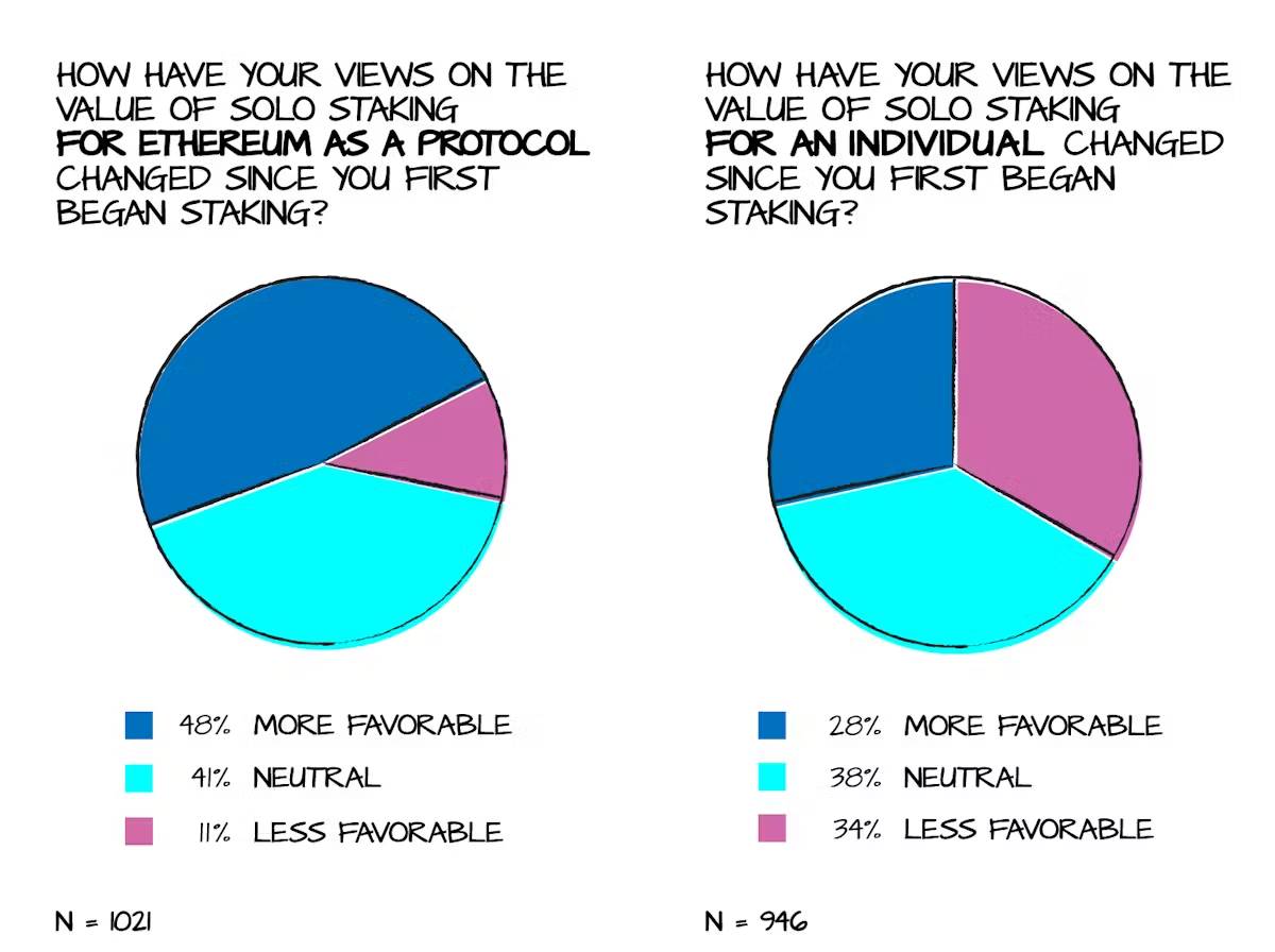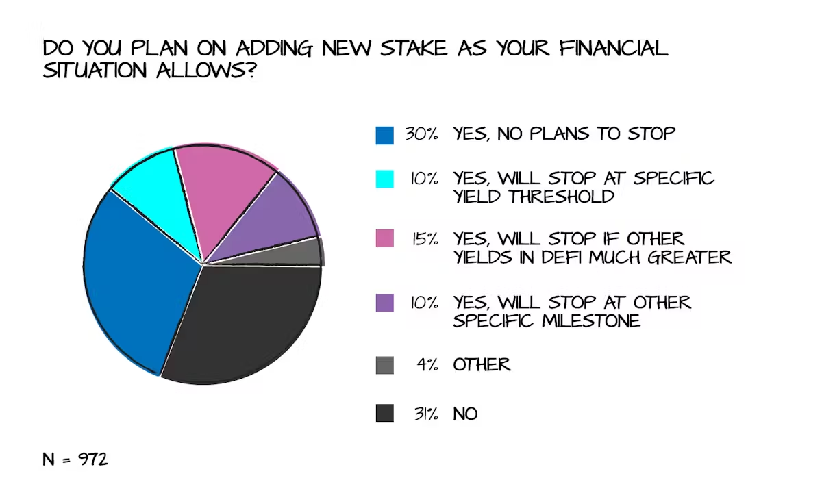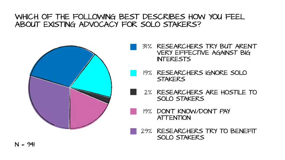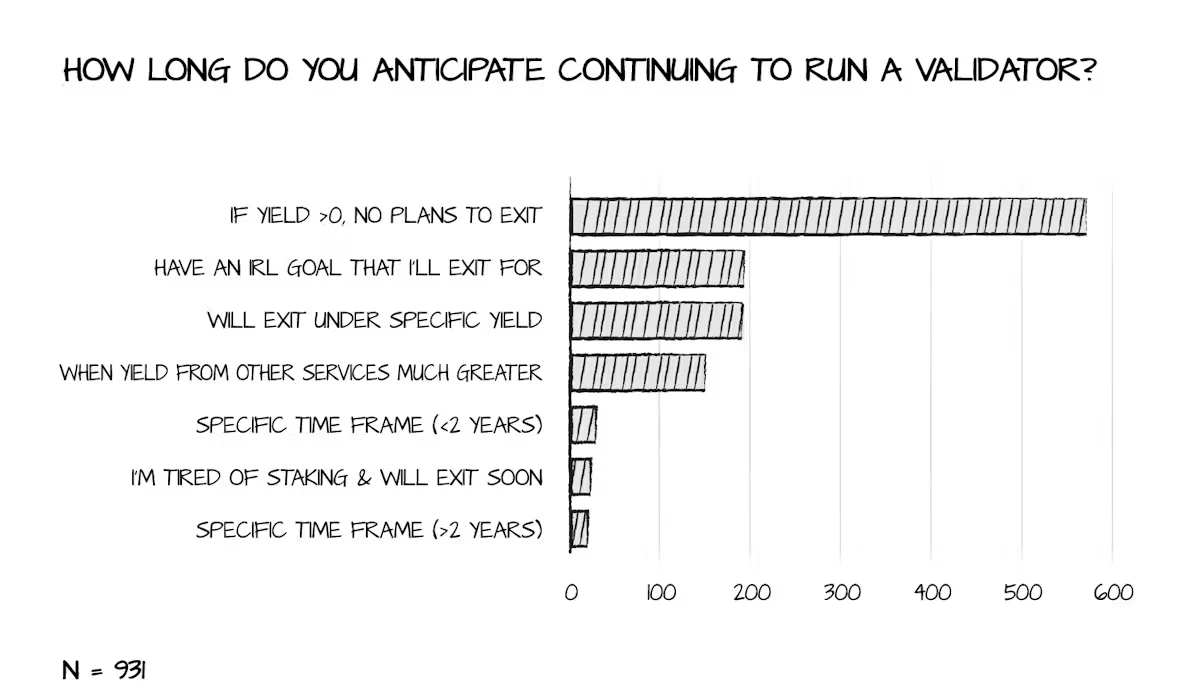 多年来,独立操作者一直被称为「非理性行为者」和「利他主义者」,有人认为他们操作的质押比委托质押者的投入更具「粘性」。本次调查无法对这两类人进行比较,但受访者确实表达了继续质押的愿望,而不管年利率的微小波动或更广泛的质押生态系统变化如何。