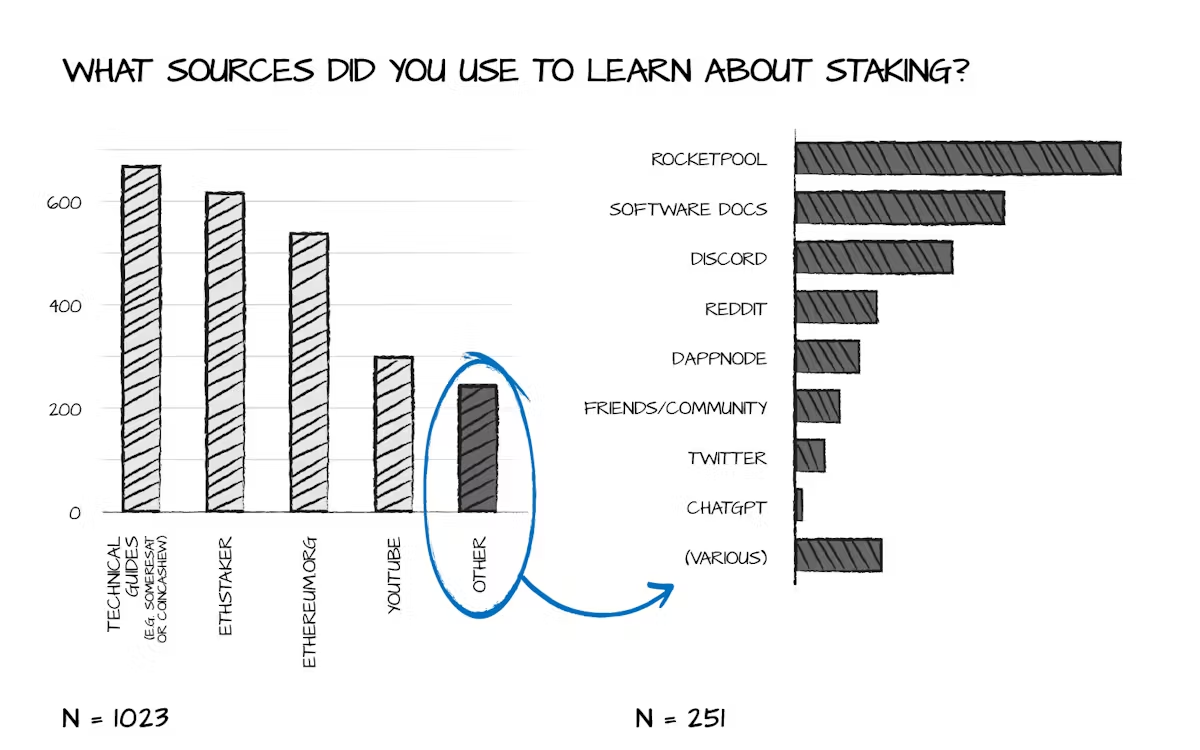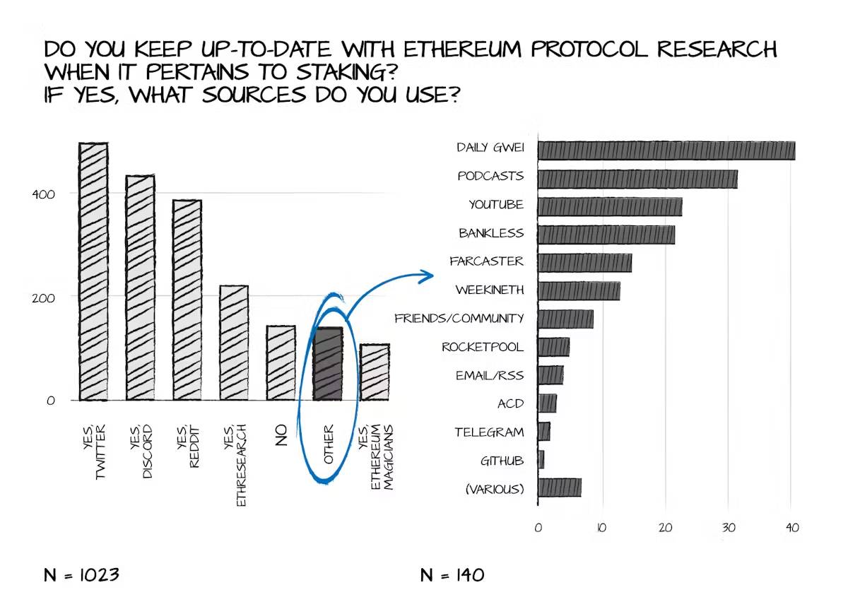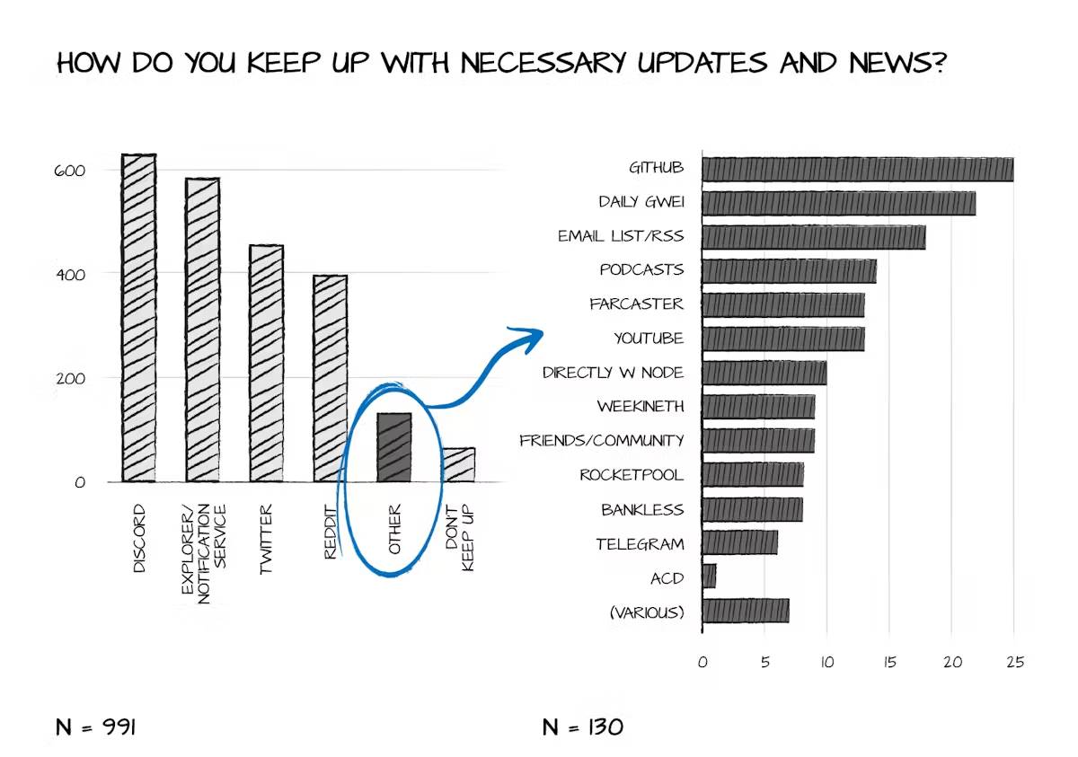 图 15:您预计验证器将持续运行多久? 质押者从哪里学习? 69% 将技术指南作为学习的主要来源(例如一些网站,CoinCashew,Rocket Pool docs,客户端文档 ) ✶ 。 63% 将 EthStaker 作为学习的主要来源 ✶。 53% 使用ethereum.org作为学习的主要来源 ✶。 据报告,了解必要更新和协议研究的最常见来源(这两个问题似乎相互混淆,因此我们将一并讨论)是 Discord、资源管理器通知服务、Twitter 和 Reddit、ethresear.ch和播客,其中相当一部分人特别提到了每日 Gwei✶。