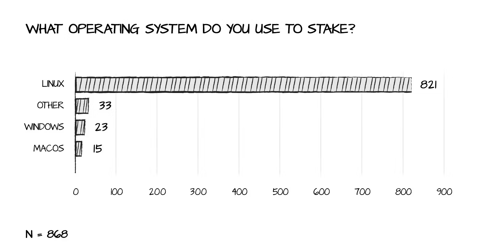 原始数据可以在这里查询。 受访者概况 32% 是 Genesis 质押者。 80% 的人是 home stakers,另有 4% 的人是 home 与远程质押的结合。 84% 的人不持有流动代币中的大量资金。 85% 的人没有改变他们的主要质押方法。 77% 的人质押了 66% - 100% 的 ETH。 30% 的人使用平滑池,61% 的人不使用平滑池,9% 的人不熟悉这一概念或不知道与他们相关的选择方案。 95% 使用 Linux 运行验证器 ✶。 51% 的人没有使用质押软件来设置验证器。27% 使用Rocket Pool, 15�ppNode和 10%Eth Docker(「未使用质押软件」一般指他们遵循指南并使用systemd) ✶。 85% 的人从一开始就没有改变过他们的质押方法。