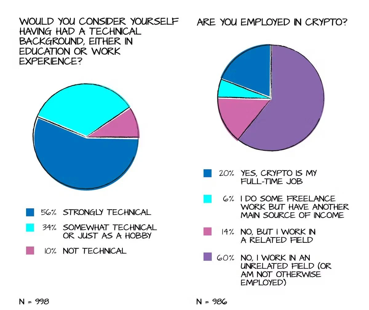 n = 204 分散化和中心化风险(n = 68):许多受访者担心当前协议的发展会产生中心化效应,以及单人质押者的代表性不足。LST 被视为一种中心化力量,会降低独立节点运行的吸引力和可行性,而再质押则是中心化的潜在媒介。 用户体验、技术障碍、硬件(n = 46):有许多人要求简化质押流程,使非技术用户更容易使用。此外,还提到了对带宽、IPV6 支持需求和遗产规划解决方案需求的关注。 发行曲线调整(n = 38):对于改变发行曲线的影响,特别是可能对独立运营商产生的影响,有很大的担忧,但也有一些人表示支持研究方向。许多人认为,收益率的下降将导致只有利于大型集中定价实体的条件。 经济和税收影响(n = 28):税收政策是单人质押者的一大负担,与持有税收待遇更优惠的流动质押代币(LST)相比,单人质押的经济可行性更低。 MEV(n = 24):在使用 MEVboost 的问题上,质押者之间存在分歧,一些人出于道德考虑选择不启用 MEVboost。这些受访者主张采用其他解决方案和进一步研究来解决 MEV 带来的问题。MEV 被认为是一种有可能使大型中央实体进行协议捕获的工具。受访者呼吁采取更有力的措施,防止 MEV 破坏以太坊的去中心化性质。 隐私问题(n = 15):质押者担心他们的操作细节(如 IP 地址和交易内容)会被曝光,从而损害他们的隐私和安全。受访者希望开发和整合隐私保护技术。受访者指出,由于缺乏隐私,一些造物主不得不对交易进行审查,从而影响了网络的中立性和包容性。 人口统计 95% 自称为男性。 90% 的人认为自己在某种程度上或在很大程度上属于技术人员。 74% 的人不从事加密工作。 88% 的质押来自北美、欧洲或澳大利亚。