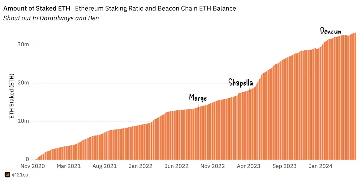 图 21:随时间推移的 ETH 质押:Shapella 之后斜率明显增加