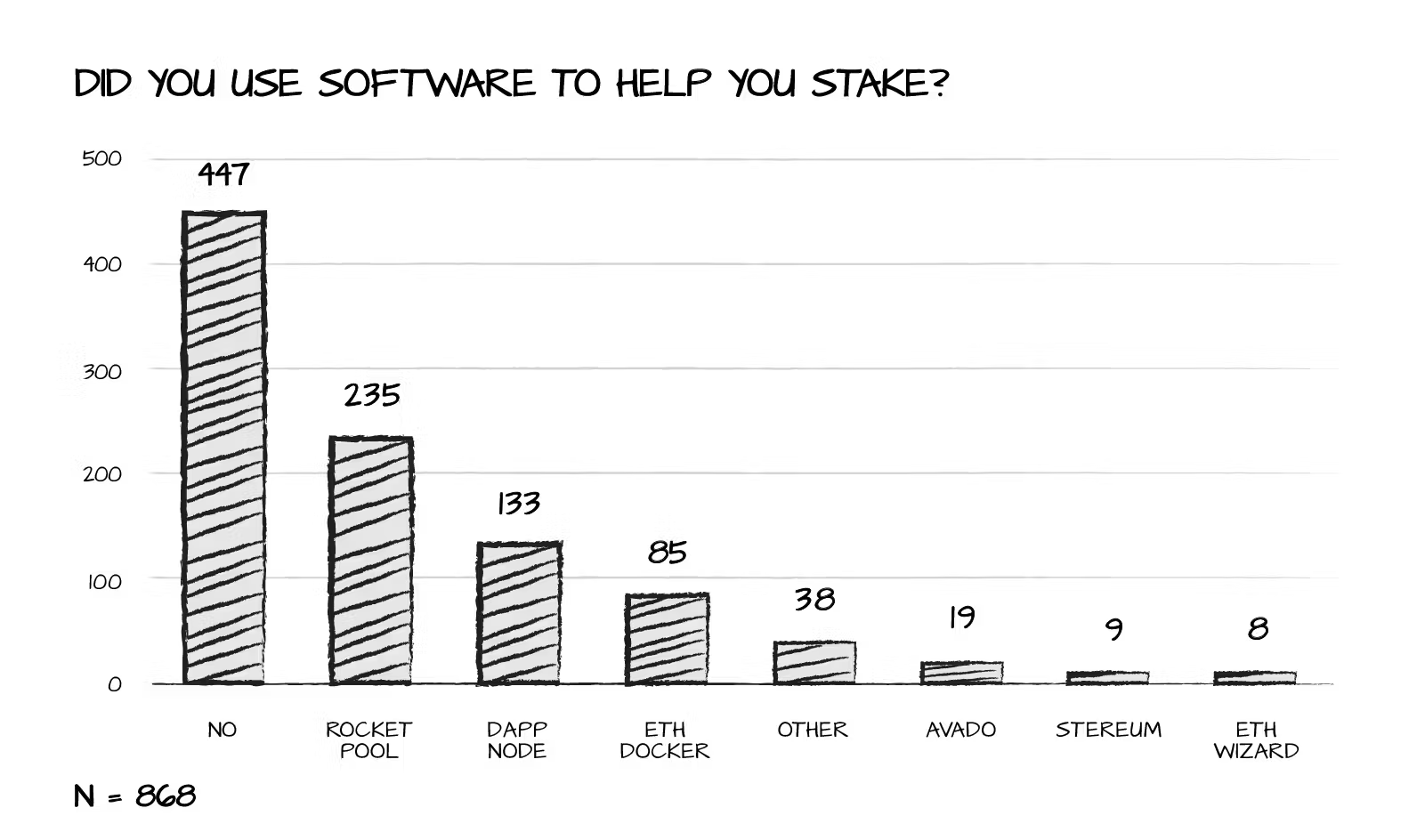 公开的节点爬虫显示,以太坊节点数在 6000 到 11000 之间。这些节点并非都是验证节点。许多节点是由专业运营商运营的。这项调查只针对使用自有资金的质押者,问题与专业运营商无关。在撰写本报告时,使用 Rocket Pool 的验证节点估计为 1832 个,这个数据是在质押快照时拥有节点 ETH 的节点数减去 Allnodes 节点数得出的。这可以作为独立运营商数量的下限。在 1024 份总回复中,有 868 份来自声称控制自己节点配置的质押者,因此我们估计大约 8% 到 47% 的节点运营商参与了这次调查,但这个范围的两端都不太可能。请注意,这个百分比包括所有节点运营商,其中也包含专业运营商。这次调查主要关注非专业运营商。