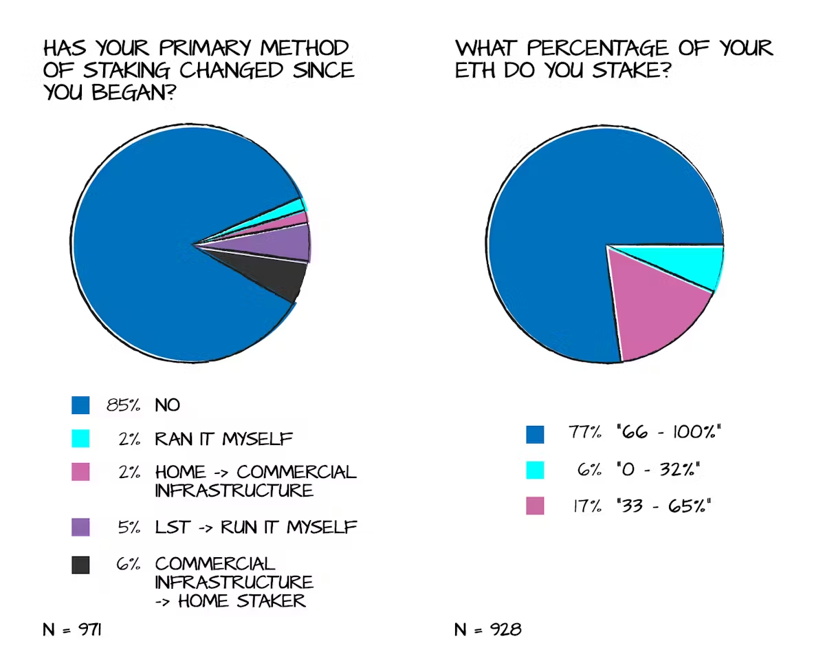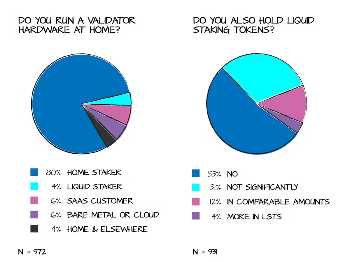 虽然数据表明人们更倾向于 home staking,而不是采用更被动的质押方式,但这可能是由于参与者和调查对象的不同。经常参与质押社区的人通常会自己管理配置。而那些不管理自己配置的人则较少关注,因为他们的验证器通常不需要他们立即关注。
