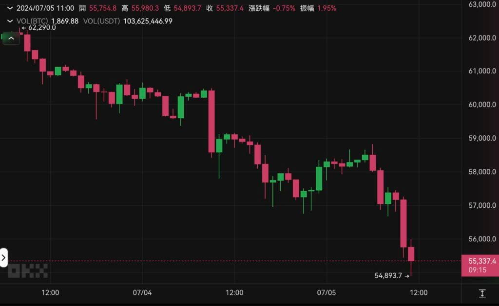 此消息或许再度带给市场恐慌情绪,比特币在上午 11 点左右一度跌破 5.5 万美元,创 4 个月以来新低。撰稿当下,比特币回弹至 55,337 美元,近 24 小时下跌 6.01%。
