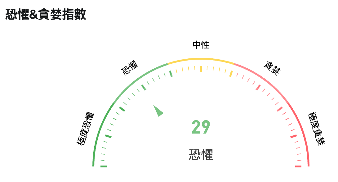 不断下杀背景下, 恐惧与贪婪指数 在今日大幅下跌,从昨日的 44 降至 29,创近 1 年新低。