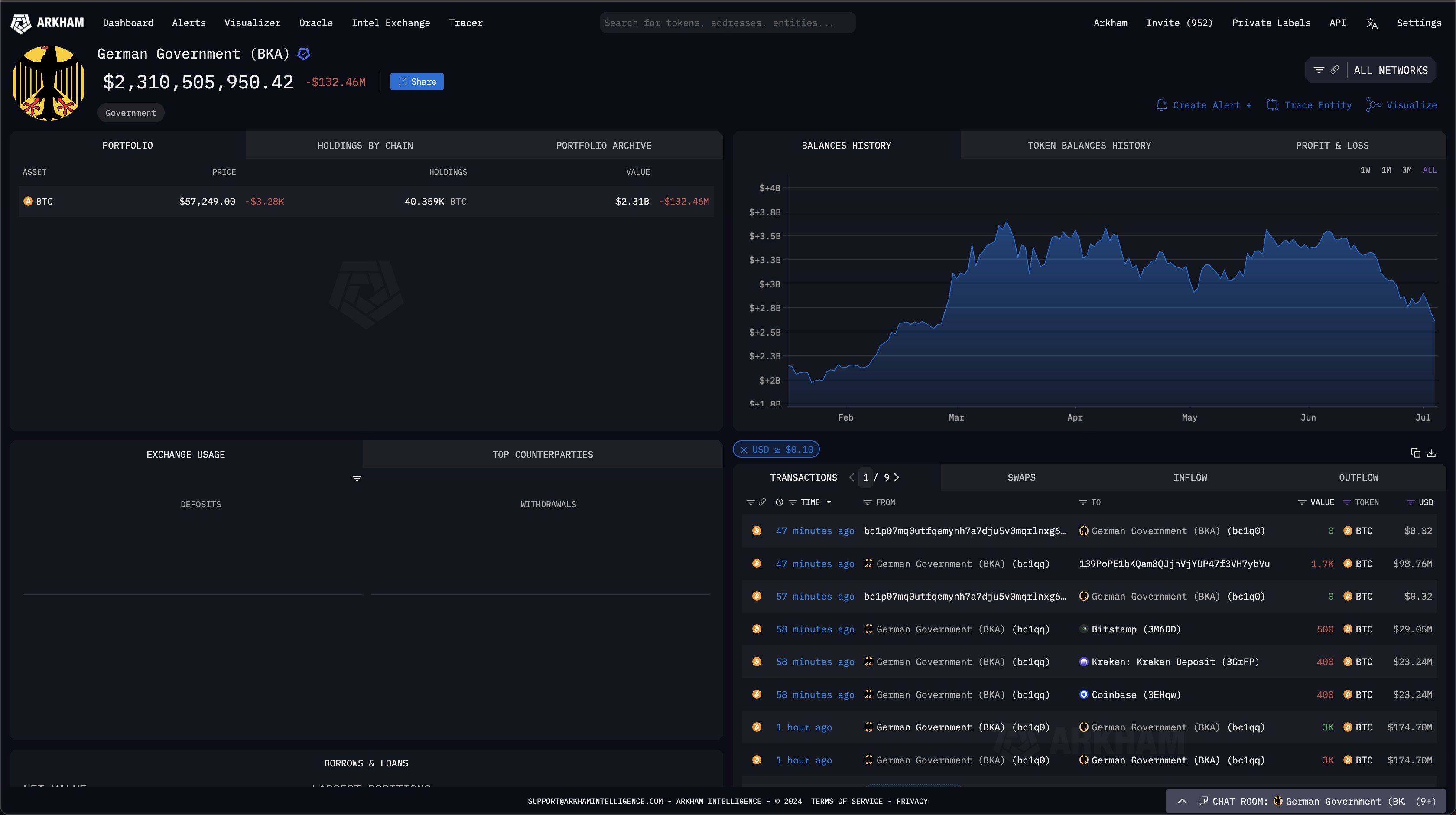 据区块链情报公司 Arkham 资讯,近两日,德国政府已将 1,300 BTC(约 7,600 万美元)转移到 Kraken、Bitstamp 和 Coinbase 等交易所。他们还转移了 1,700 BTC(约 9,900 万美元)到地址 139Po。这些资金可能会转移到机构服务或场外交易的存款,目前德国政府仍在链上标记地址中持有 40,359 BTC,总价值约 23 亿美元。