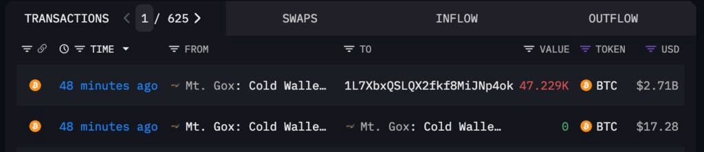 比 特币市场近期跌跌不休,市场归咎于几个原因:德国政府出售、Mt.Gox 还款、现货 ETF 资金流入放缓…。而在稍早八点半左右,根据 Arkham 追踪数据 显示 ,Mt.Gox 已将 47,228 枚 BTC(高达 27 亿美元)从冷钱包转移到(1L7Xb…)𫔭头的钱包,大概率是为还款做準备。