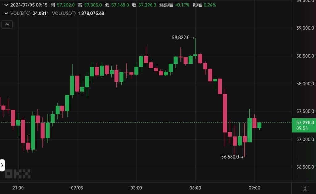 或受此影响,比特币在相同时间最低插针至 56,680 美元,非常接近 5 月 1 日创下的前低 56,552 美元。撰稿当下,比特币回弹至 57,298 美元,近 24 小时下跌 4.89%。