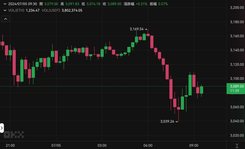 以太坊部分,波动较比特币又来的更高一些,稍早最低插针 3,039 美元。撰稿当下回弹至 3,089 美元,近 24 小时下跌 5.43%。