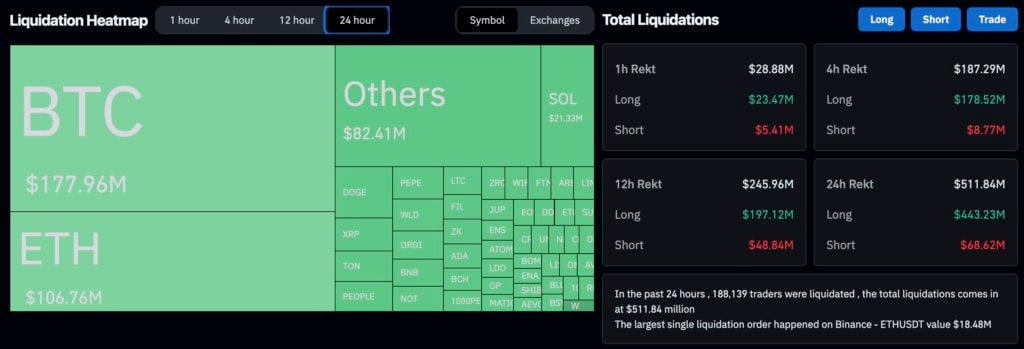 比特币反覆洗盘的行情下,据 Coinglass 数据 显示,过去 24 小时,加密货币全网爆仓金额超过 5.1 亿美元(是昨天约两倍),有超 18.8 万人遭清算。