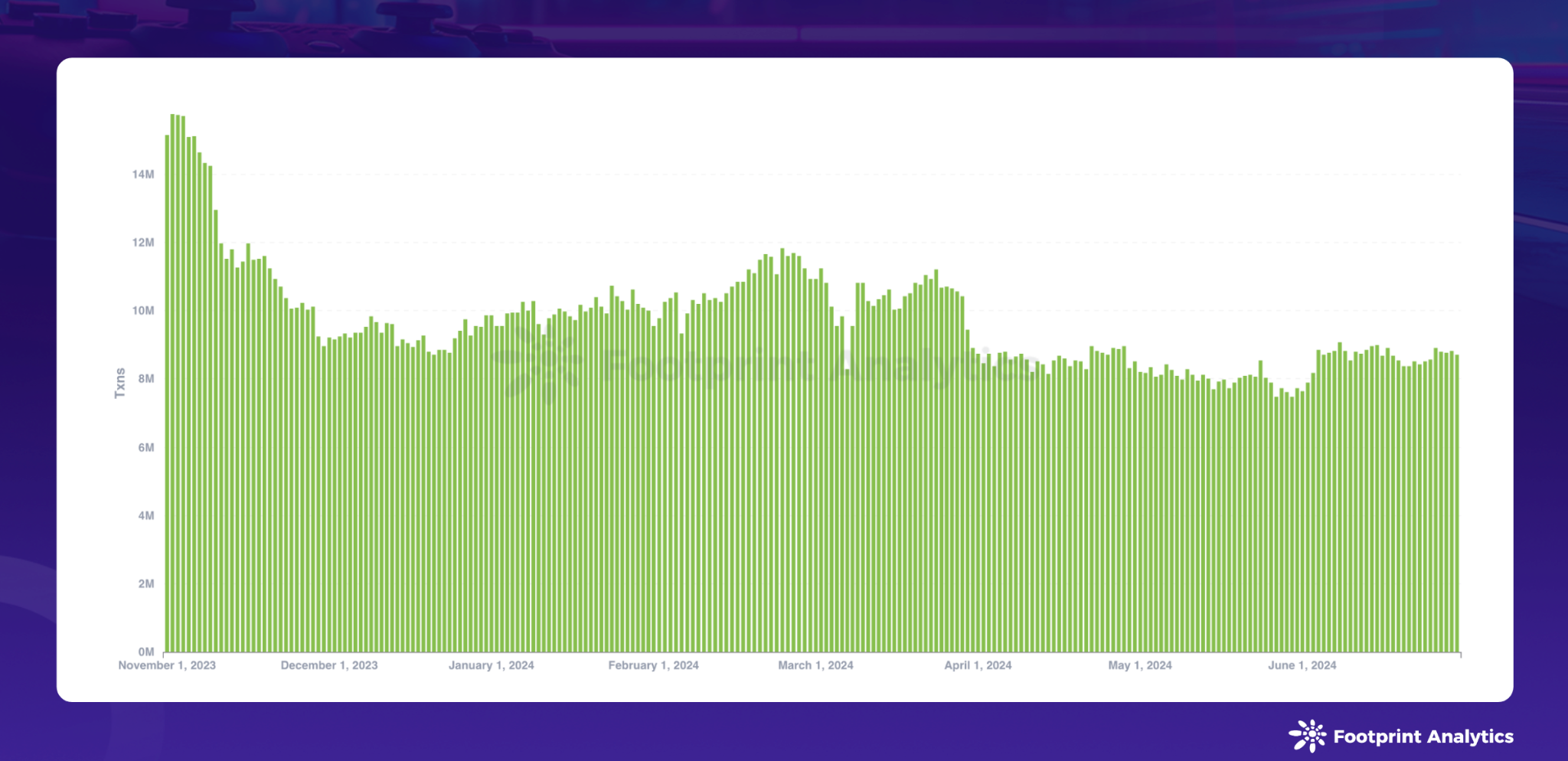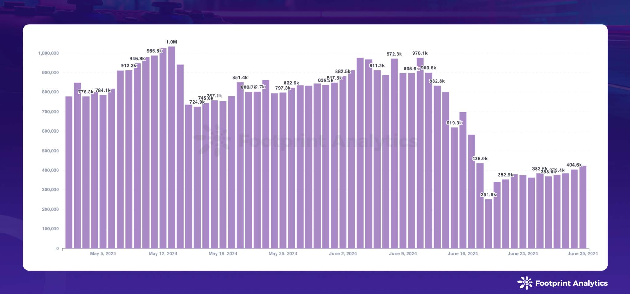 Pixels 在 2023 年第四季度从 Polygon 迁移至 Ronin 网络后,其 DAU 实现了显著增长,并于 5 月 13 日达到了 100 万 的峰值。然而,其 DAU 从 6 月 11 日的 97.6 万急剧减少至 6 月 19 日的 25.2万,降幅高达 74.2%。对比来看,5 月的平均 DAU 为 84.2 万,而 6 月则下降至 64.7 万,下降了 23.2%。