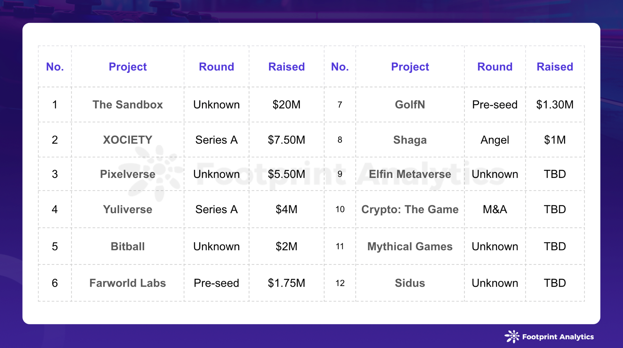 6 月份,Web3 游戏领域通过 12 次融资活动共筹集到了 4,305 万美元的资金,其中 4 次融资活动的具体金额并未对外公布。这一总额与上月的 4,495 万美元相差不大。