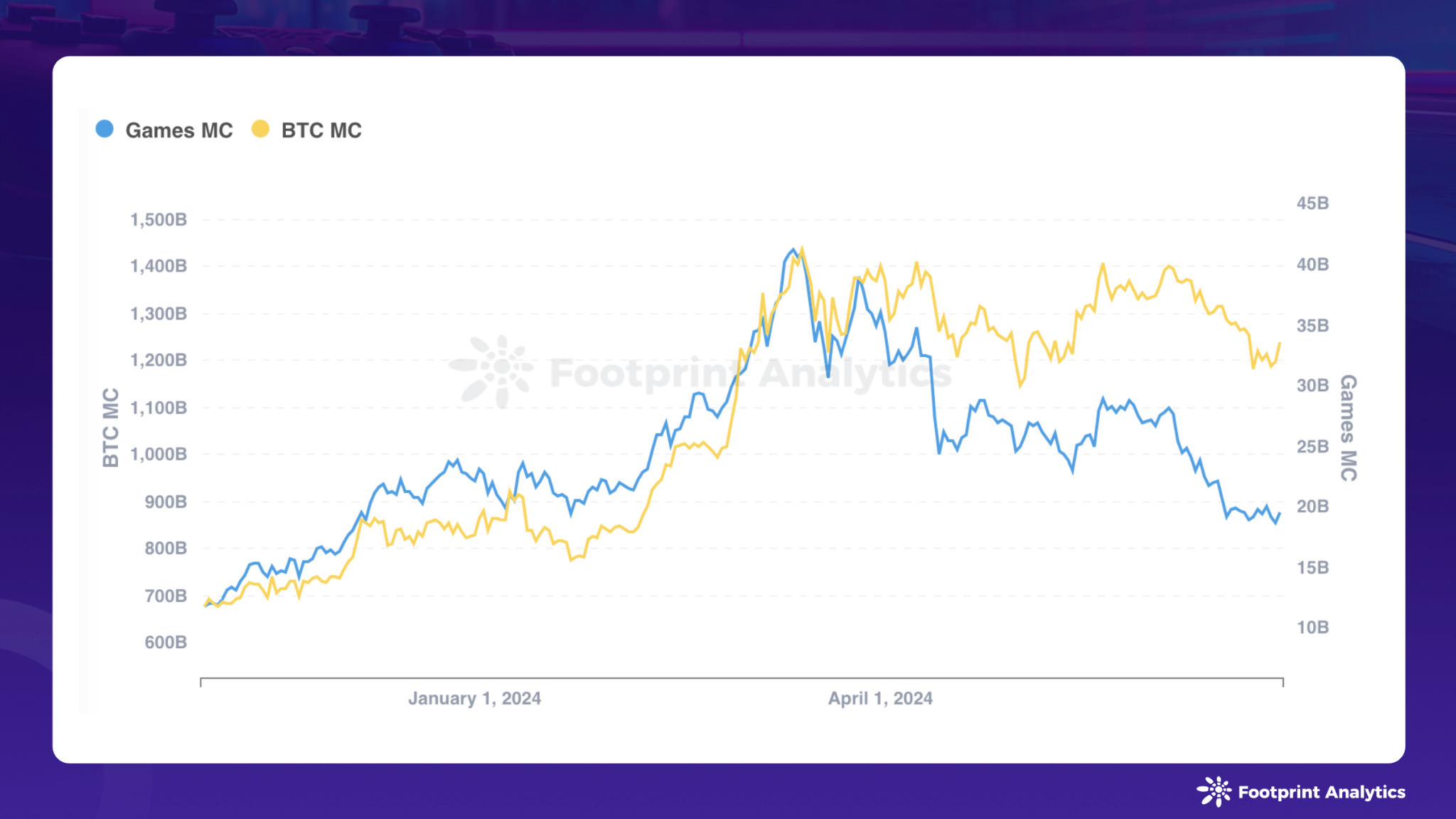6 月,区块链游戏代币的总市值从 272 亿美元缩减至 196 亿美元,降幅高达 28.1%。这一显著下滑直接反映了游戏代币价格的普遍下滑趋势,其背后原因则在于比特币及整个加密货币市场的低迷表现。