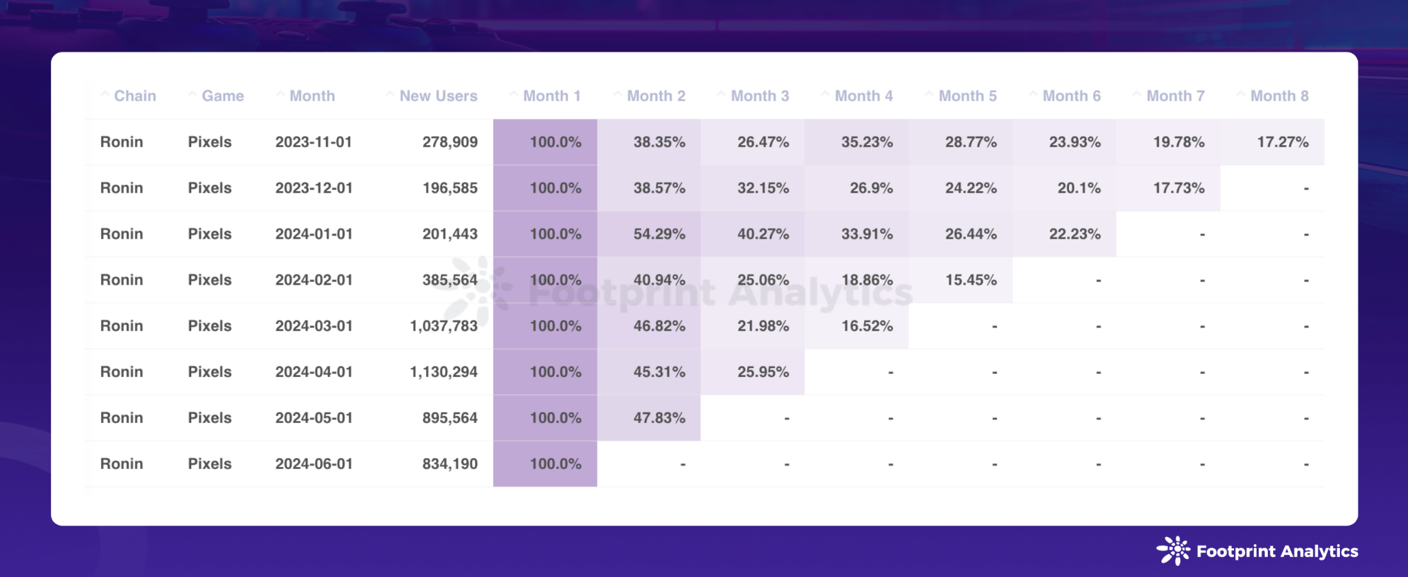 举例来说,尽管 6 月份 Pixels 的 DAU 出现了明显下降,但自迁移到 Ronin平台后,其月度留存率表现强劲,达到了可与 Web2 游戏相媲美甚至更优的高水平。具体而言,Pixels 在第二个月的平均留存率超过了 40%,而到了第六个月,这一数字仍保持在 20% 以上。