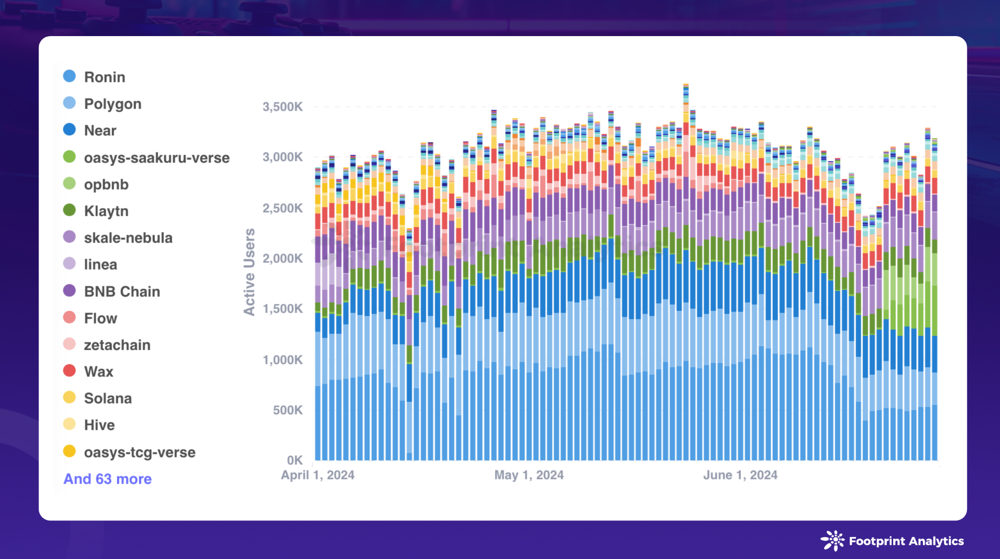 同时,在 300 万 DAU 中,Ronin、Polygon 与 NEAR 虽继续领跑,却也面临诸多挑战。Ronin 的 DAU 占比受 Pixels 影响,从月初的 29.8% 滑落至月末的 18.4%。而 Polygon 方面,由于旗下最大 DAU 游戏 Matr1x FIRE 的 DAU 环比下降 31.6%,其 DAU 占比亦从 15.1% 缩减至 8.0%。